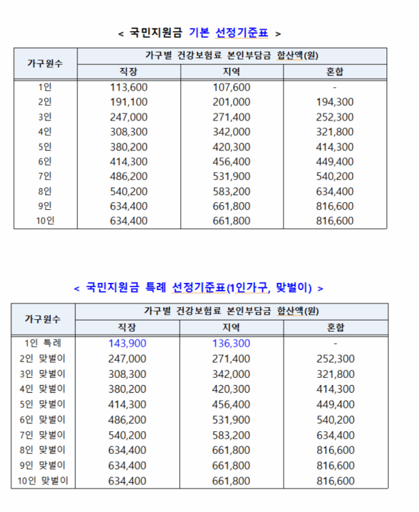 양육비 지원 한 부모 가정, 차상위계층, 기초생활수급자 등은 기존 생활지원금 수급 계좌로 1인당 10만 원씩 일괄 지급됩니다. 별도의 신청은 필요 없음. 국민지원금 건보료기준은 아래표와 같습니다.